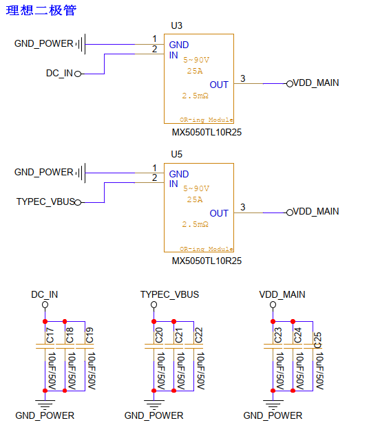 3、Typec电源与直流电源共同输入的部分,本来想简单用个二极管的,但参数上还是差了些,还是用理想二极管更合适些