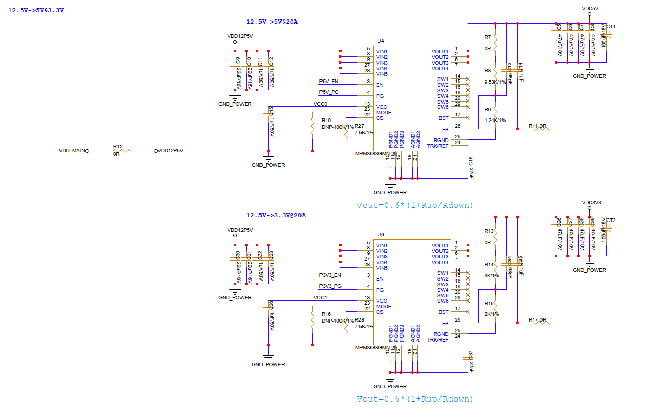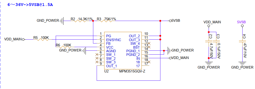 MPM3683 IC在参考设计中是区分AGND和GND的,建议在原理图设计中也要做好地划分,以免敏感信号受到干扰