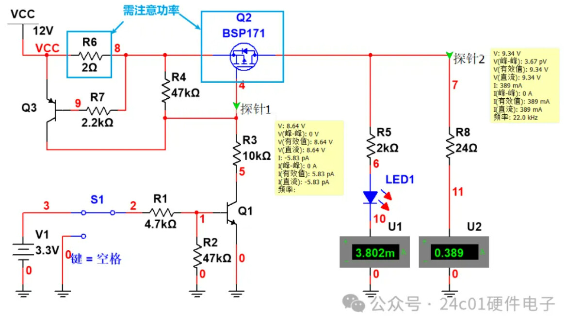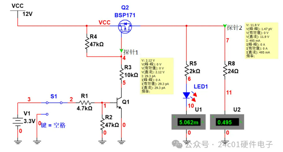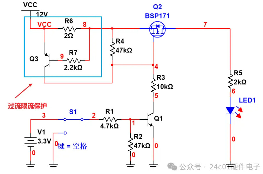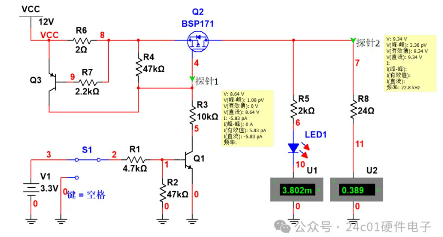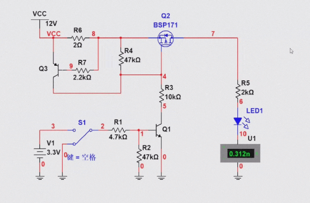 那么我们就对增加了过流限流的电路进行仿真,仿真结果如下,可以看到,当S1开关拨到3.3V时,此时Q1三极管导通,然后Q2导通,LED灯亮,此时由于负载电流为5mA左右,所以R6两端的压降为10mV左右,所以说Q3处于截止状态;