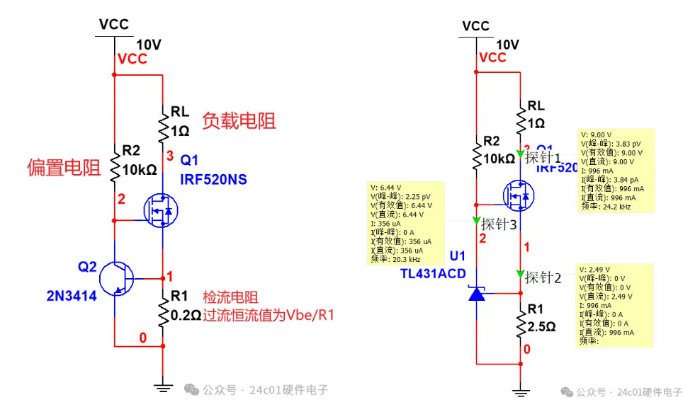 在上篇帖子我们分析过两期过流限流保护电路,分别是三极管+NMOS,431+NMOS做的过流限流保护电路,电路图如下