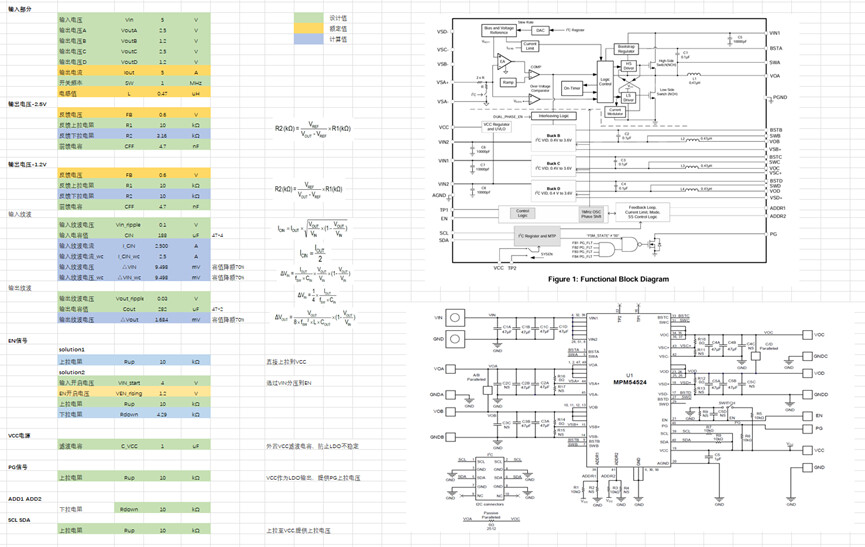 本次设计中MPM54524输入为SYS_5V,输出A-D分别设置为2.5V/1.2/2.5V/1.2V,开关频率采用默认配置FCCM=1000kHz,同时预留了IIC调试接口。