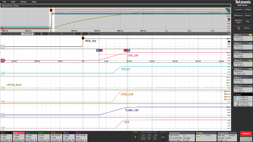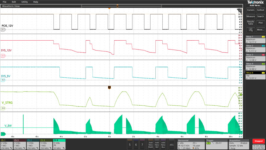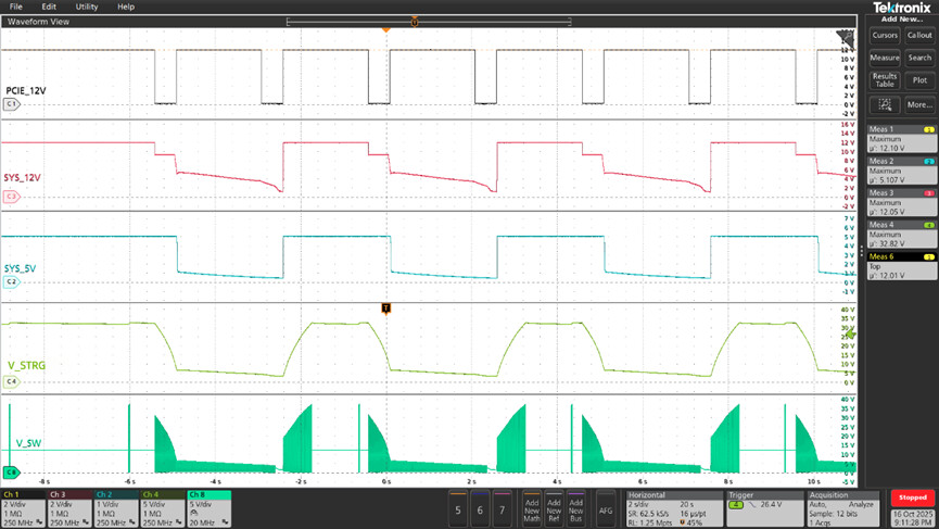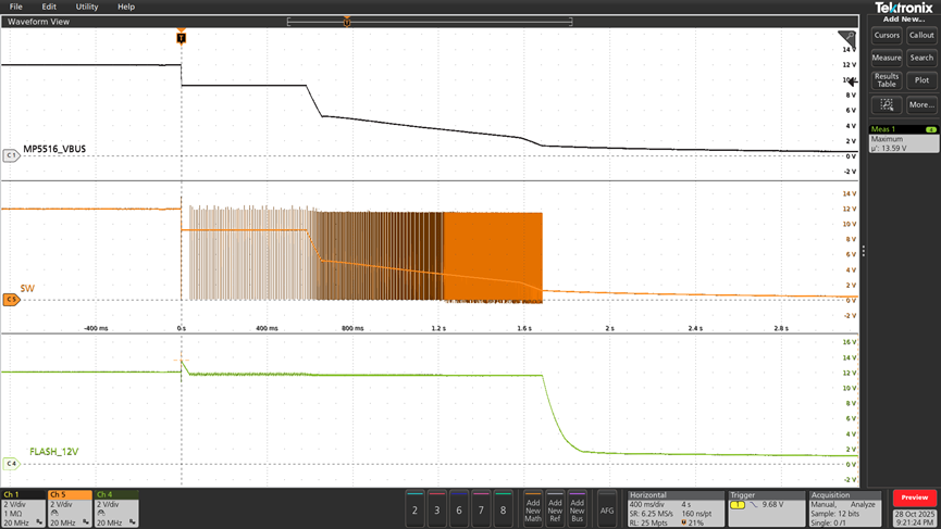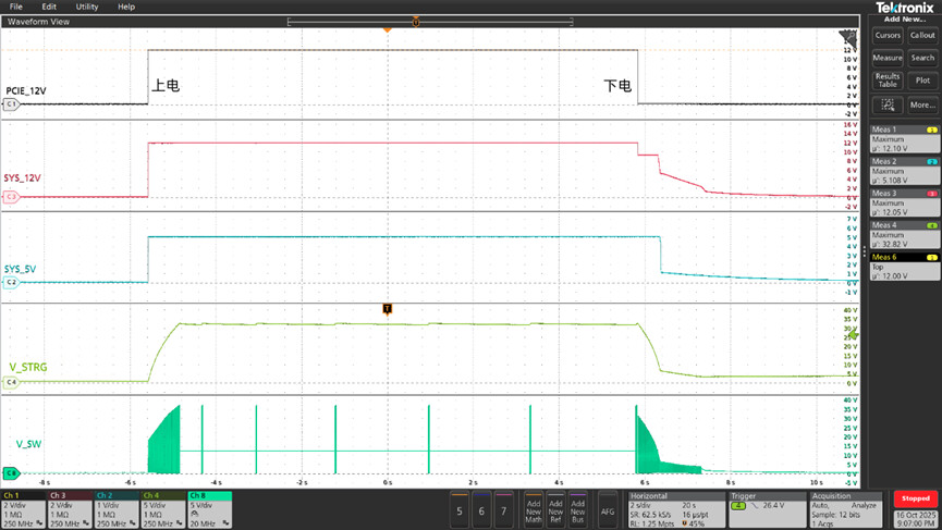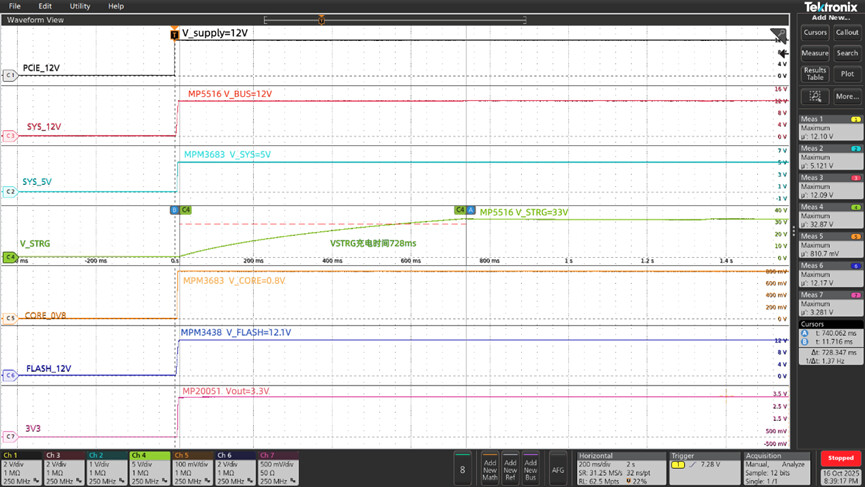 ①上电波形:外部电源供电+12V,MP5516进行boost工作模式,V_supply给后级V_BUS供电,同时给储能电容V_STRG进行充电