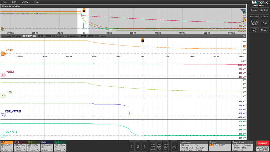 ④下电波形:关闭外部输入时,MP5516进行buck工作模式,V_STRG(33V)降压V_BUS(9V),后级负载掉电保持500ms