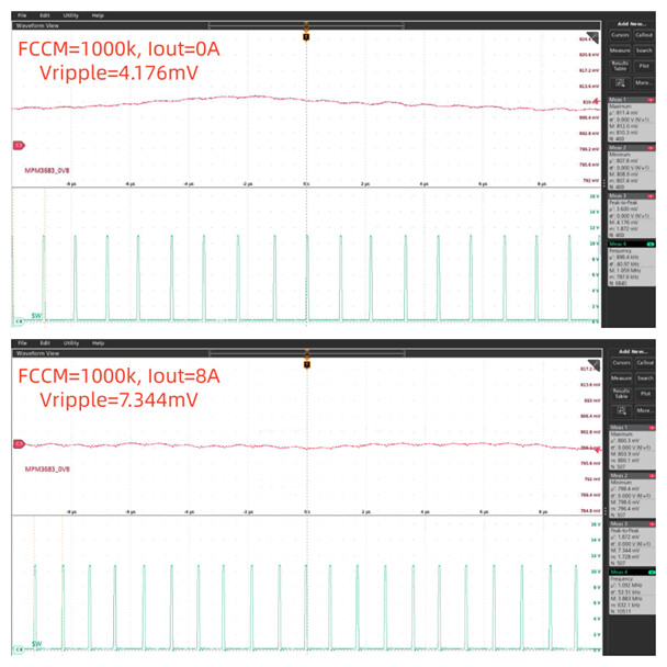 纹波测试使用了DC+Offset的方式,可以看出MP3683在轻载和重载下都提供了非常好的输出纹波,输出电流8A下,纹波只有7mV左右。