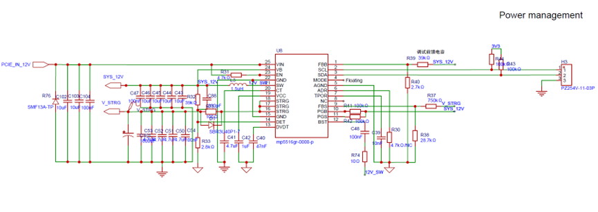 MP5516的输入为外部电源,输出为SYS_12V(+12V)电压,同时通过boost功能升压到V_STRG(33V)给储能电容进行充电。