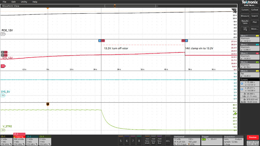 阶段一:输入电压从12V增加到13.2V时,触发过压保护逻辑,MP5516会关闭V_STRG,停止boost功能。