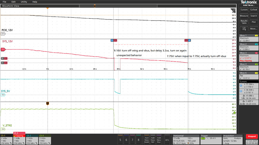 阶段1:输入电压从12V降低到9.16V时,触发过压保护逻辑,MP5516同时关闭V_STRG和VBUS,但经过3.2us后再次将VBUS开启。(不知道这个电压跌落是否符合预期)