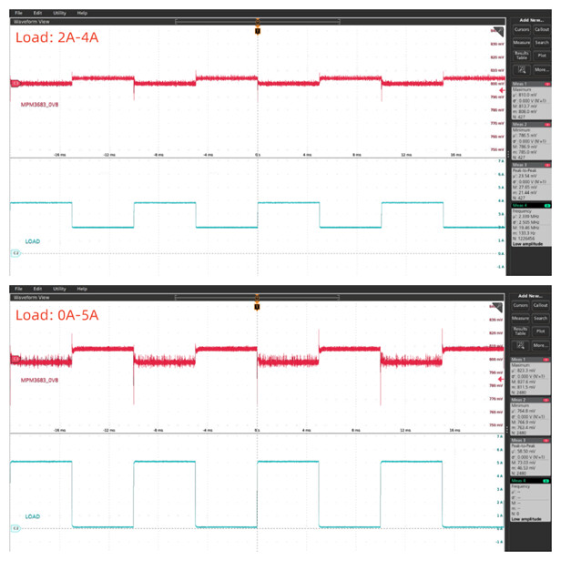 可以将0.8V和5V输出端的MLCC电容数量增加10%到30%,并确保使用的是X7R材质的低ESR/ESL电容。另外仔细检查MPM3683-10输出到负载点的功率路径走线是否宽且短,特别是输出电容与芯片和负载之间的连接。不良的布局会引入额外的电感,导致动态响应恶化。