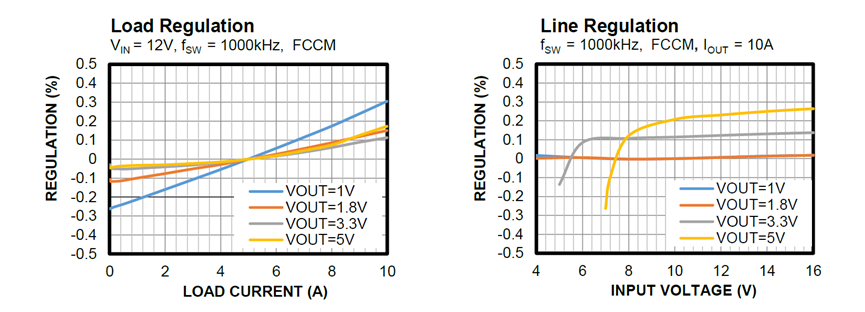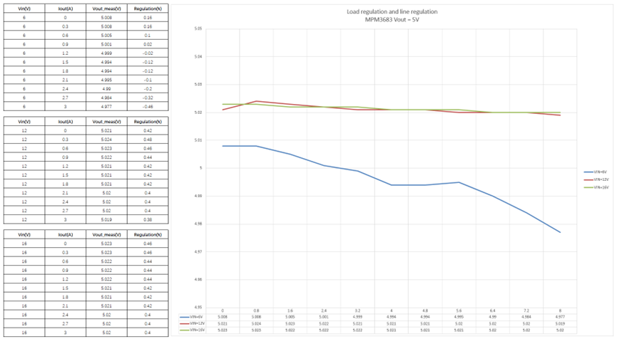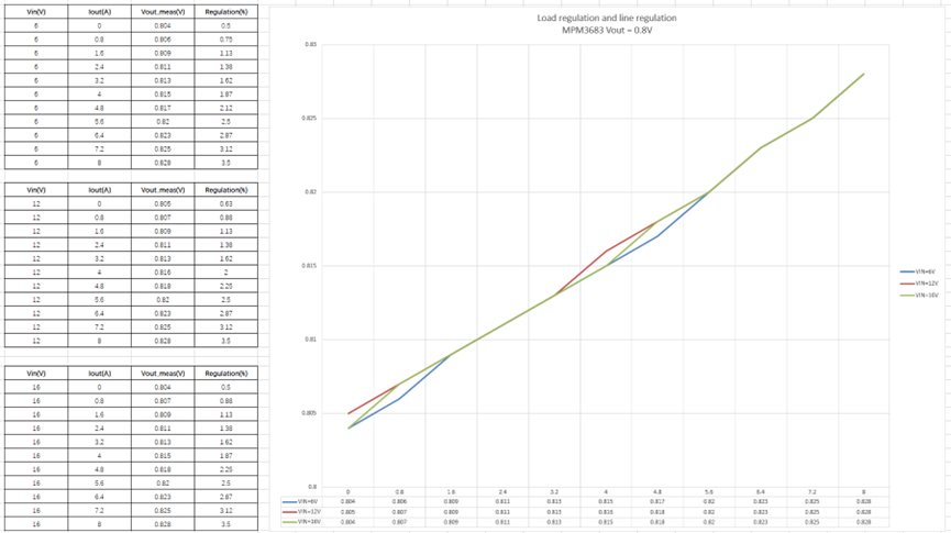 MPM3683在不同输入和不同负载都表现出了很好的电压调整率,以下分别测试了在0.8V输出和5V输出下的数据。