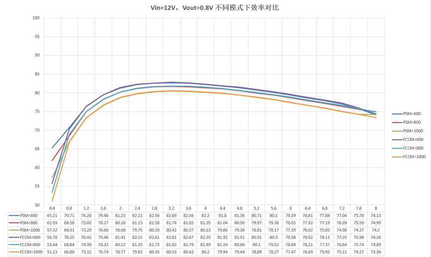 ①PSM比FCCM在轻负载(Iout<1A)下效率更高,负载电流高于1A后,效率几乎一致;