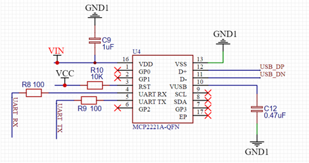 协议转换的原理图部分如下所示,芯片用的是MCP2221A,这颗芯片可以将USB信号转换成UART信号和IIC信号,可以与被更新的电源中的DSP进行数据通信。