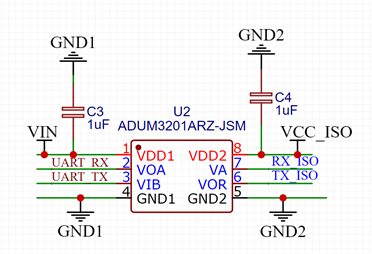 数字信号隔离的原理图部分如下所示,芯片用的是ADUM3201,因为对热地进行了隔离,所以对数字通信信号也需要进行隔离,该芯片的初级和次级输入电压均由MIE1W0505进行供电。