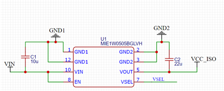 热地隔离的原理图部分如下所示,芯片用的是MIE1W0505,具有2500V的耐压值,可以通过VSEL引脚的电压设置,选择适配被供电设备的电源轨。