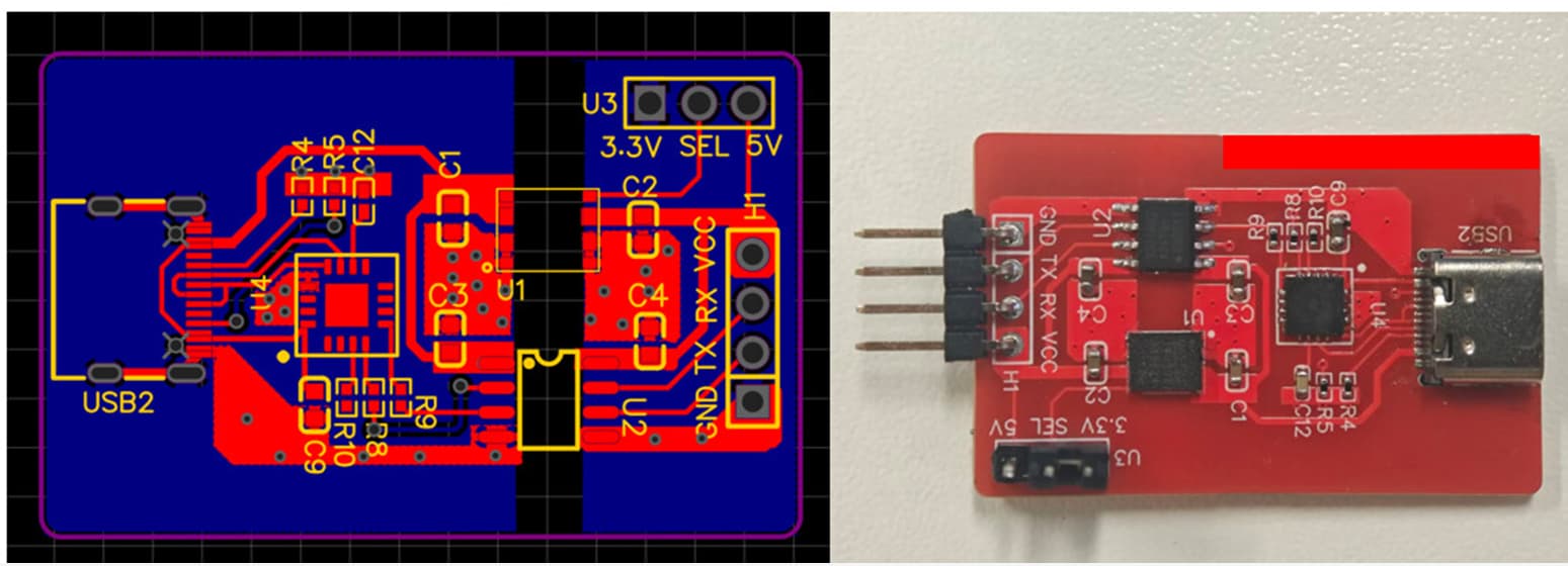 系统的软硬件都是使用国产EDA工具进行绘制,原理图上主要是三种芯片:隔离电源芯片、UART转串口芯片和数字信号隔离芯片,外加一些接口芯片。PCB使用两层Layout,设备地与热地有几个毫米的隔开,板子上有Type-C接口,可以直接连上USB线对数字电源进行固件不掉电升级。