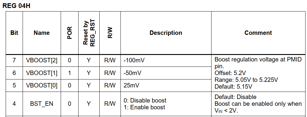 电池供电,从PMID输出,要写什么寄存器吗?我现在用电池供,电池有3.9V,但是PMID只量到3.65V,一接负载就掉到3.1-3.2V了,引出其他问题,搞得我的CPU和电源管理一直在重启。
