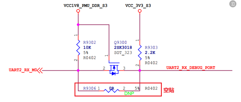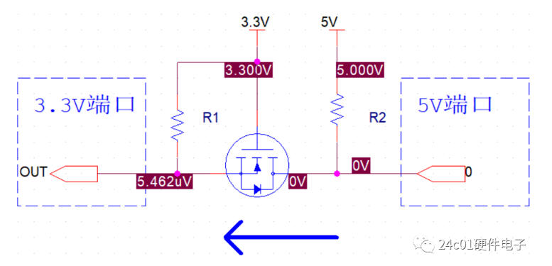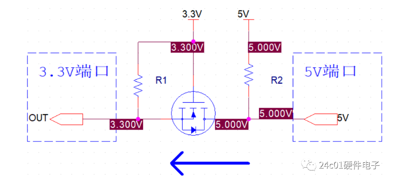 左边3.3V管脚输出为高电平时,NMOS的Vgs=0V,此时NMOS关断,5V管脚被R2上拉为高电平。