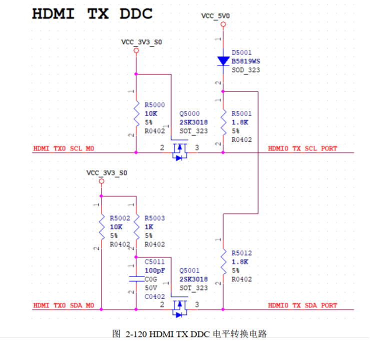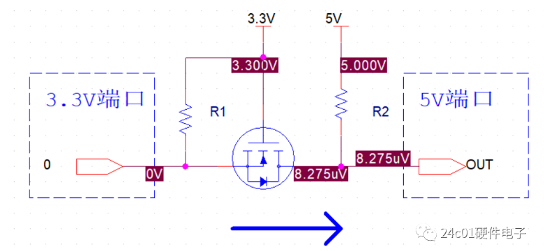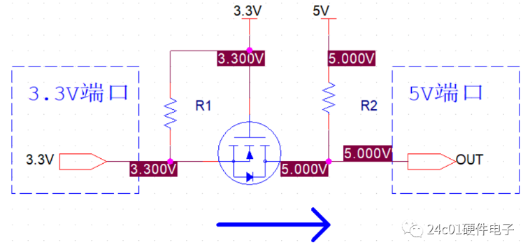 由于是3.3V和5V的转化电路,所以分以下四种情况: