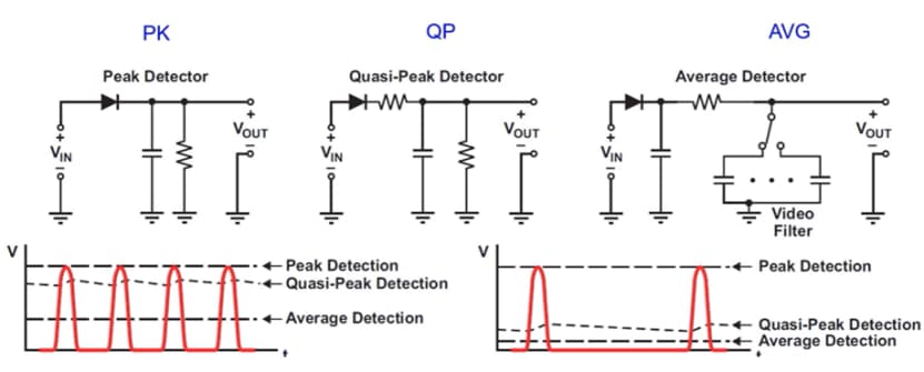 特点:平均值检波器的充放电时间常数相同,特别适用于对连续波的测量。某些传导辐射需要使用平均值搭配准峰值检波器测量。此外,高于 1 GHz 的辐射发射测量也利用平均值检波器来进行。平均值检波器的输出永远小于或等于峰值检波器的输出。