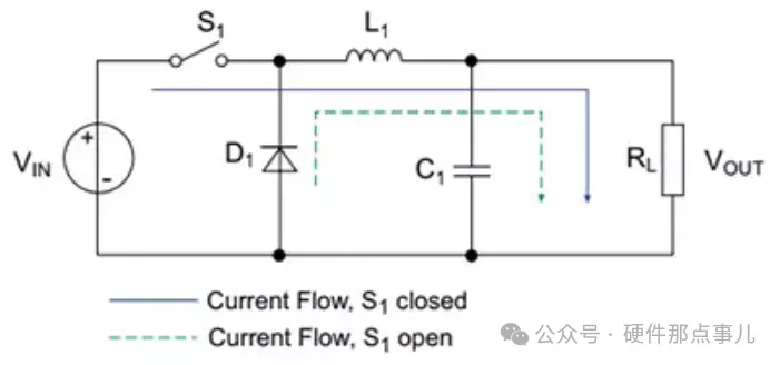 当电感一端连接到输出端,另一端通过开关与输入电压连接,并通过二极管与地相连时,电路构成Buck变换器。开关导通时,输入电压通过电感向输出端充电;开关关断时,电感通过二极管维持输出电流。