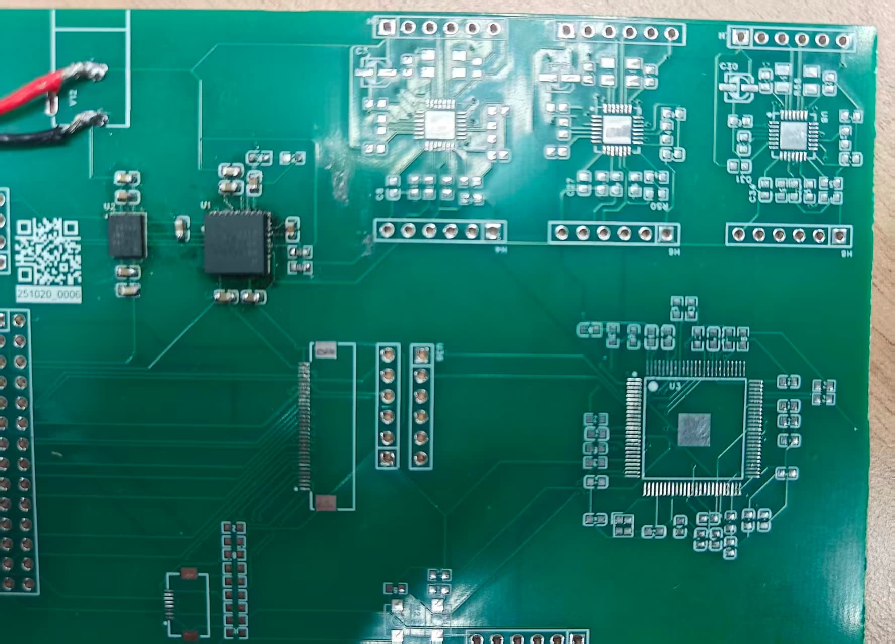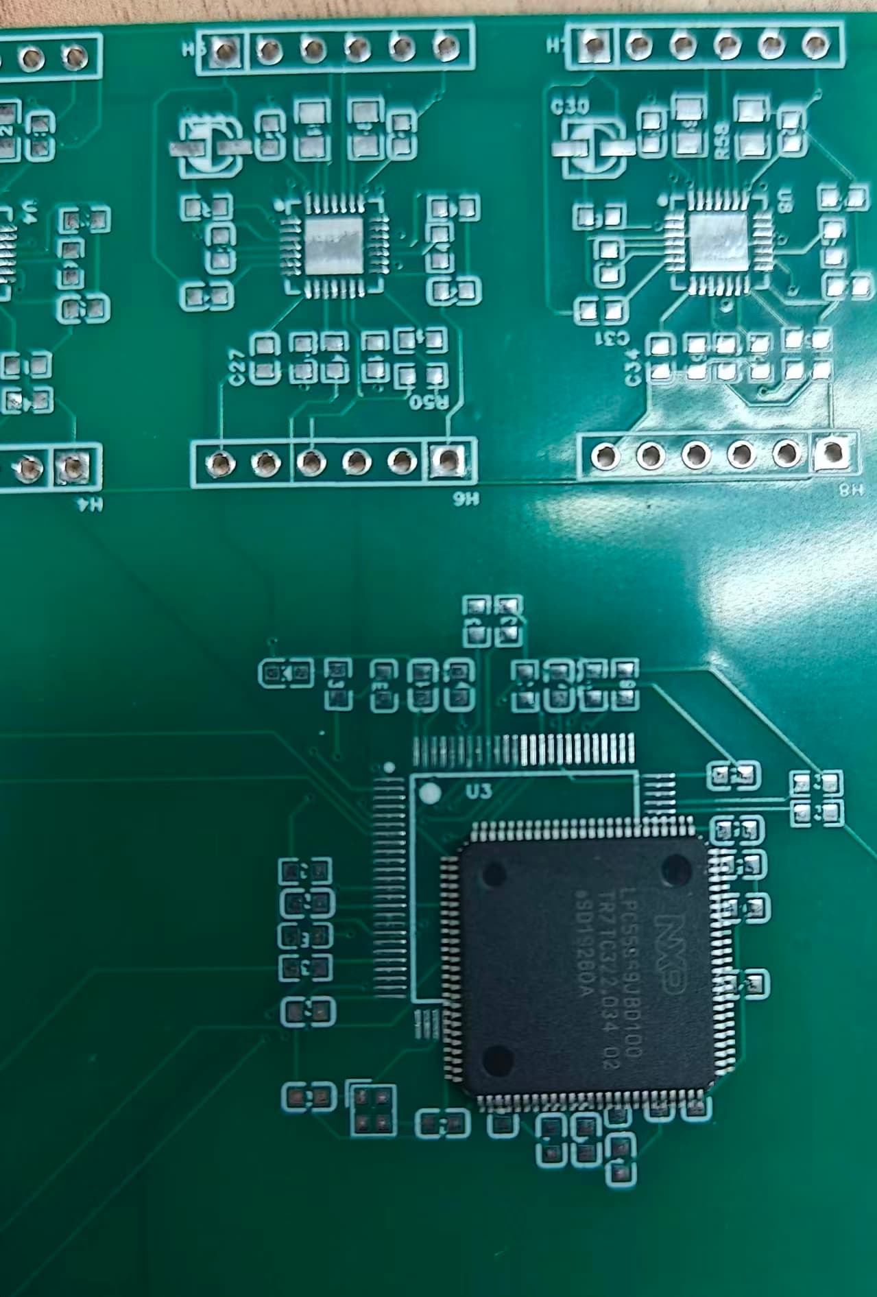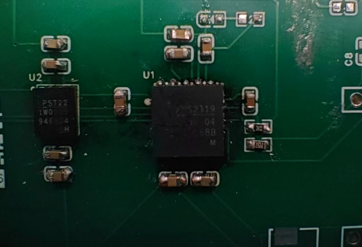 经过排查感觉设计没有大的问题,那么焊接的问题比较大。所以,拆下来一看,果然,如下图,有明显漏焊的地方。有些引脚完全没有着锡。