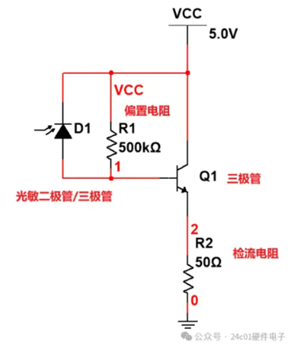 当V2为低电平时,下管Q2导通,上管Q1截止,负载放电,电流路径如下图所示,蓝色为基极电流Ib,红色路径为集电极电流Ic,其中Ic = β*Ib。当负载放电到0V+Vbe时(忽略R1上的压降),下管Q2截止,所以输出最小值为0.7V左右。