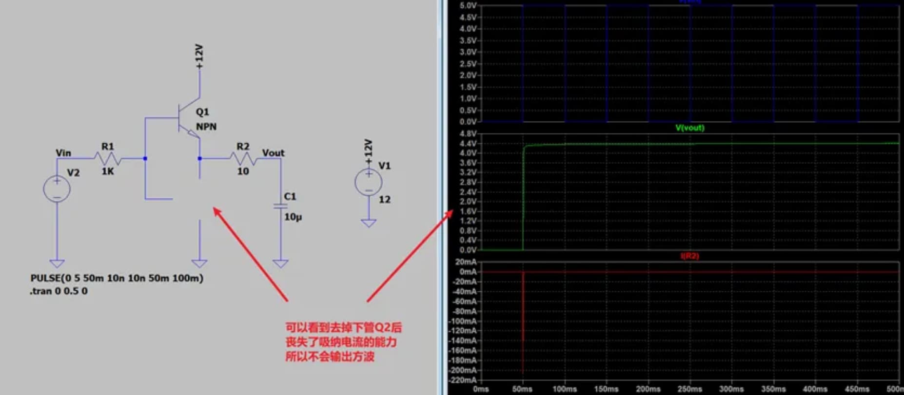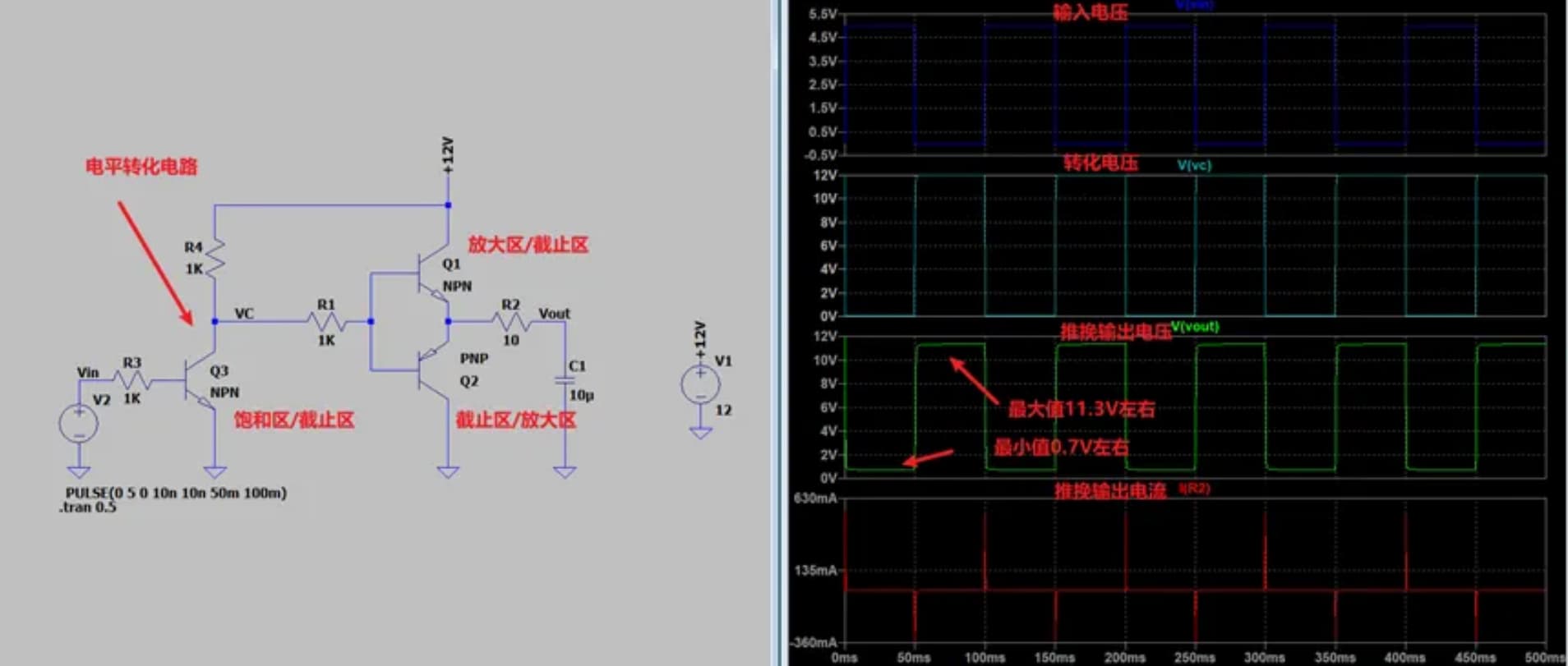 那么**如何让其输出为B选项的0.7V~11.3V的方波呢?其实也很简单,只需要将V1方波信号改为12V的输入即可,或者就是再增加一个三极管做电平转化。**不过这样做会对上下管带来什么样的不同呢?