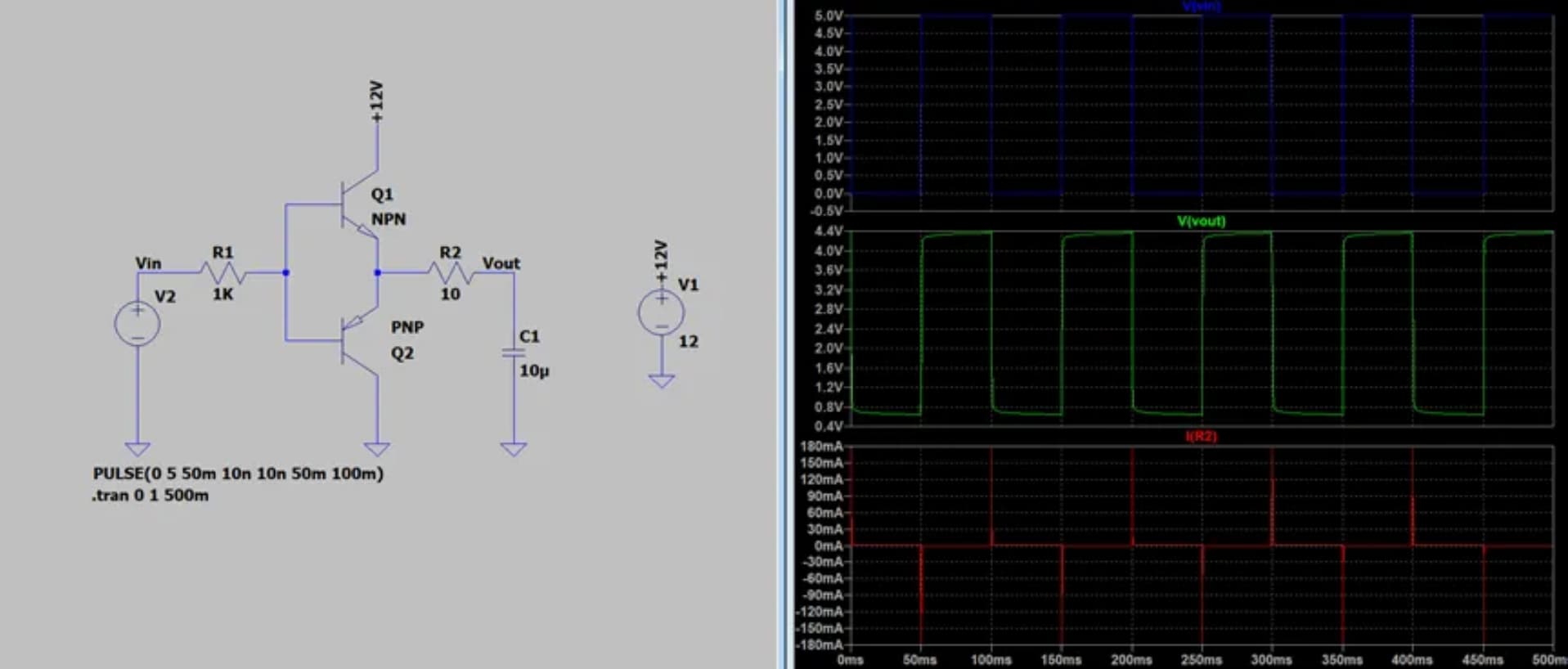 通过仿真可以验证这一个想法,仿真结果如下,因为电容C1上的电放到接近VINmin+Vbe时下管Q2就截止了,所以输出波形最小为0.65V左右;当电容C1上的电充到VINmax-Vbe时上管Q1就截止了,所以最大值为4.3V左右。所以说推挽的输出信号就是跟随输入信号的,即推挽就是两个射极跟随器的结合。