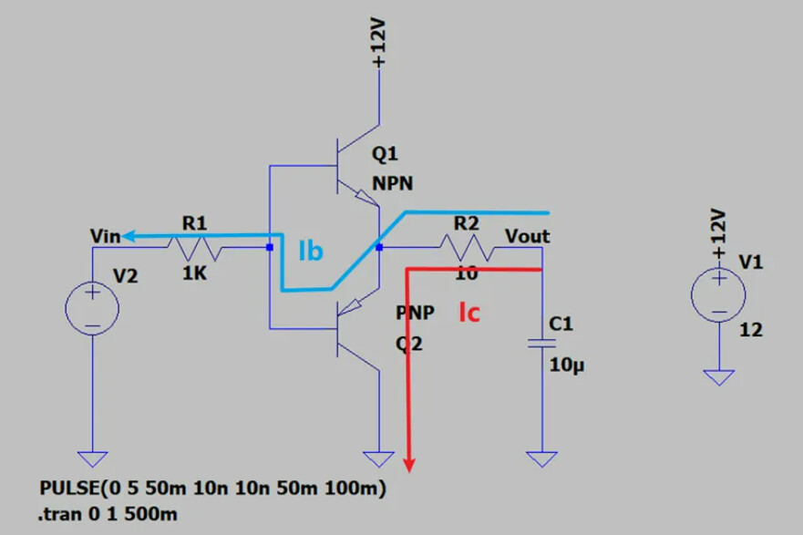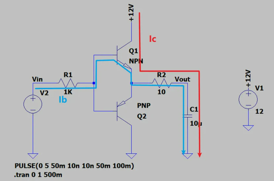当V2为高电平时,上管Q1导通,下管Q2截止,负载充电,电流路径如下图所示,蓝色为基极电流Ib,红色路径为集电极电流Ic,其中Ic = β*Ib。当负载充电到5V-Vbe时(忽略R1上的压降),上管Q1截止,所以输出最大值为4.3V左右。