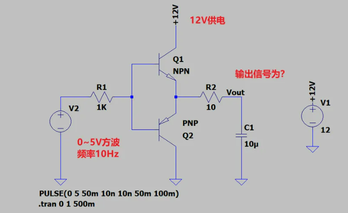 以上均是射极跟随器的应用,那么这样再看推挽输出电路,是不是就有点眼熟了呢?**推挽就是一个NPN型的射极跟随加上一个PNP型的射极跟随!**那么例如下图,输入为一个5V频率为10HZ的方波,假设Vbe=0.7V,那么请问输出波形是什么(不考虑RC滤波)?
