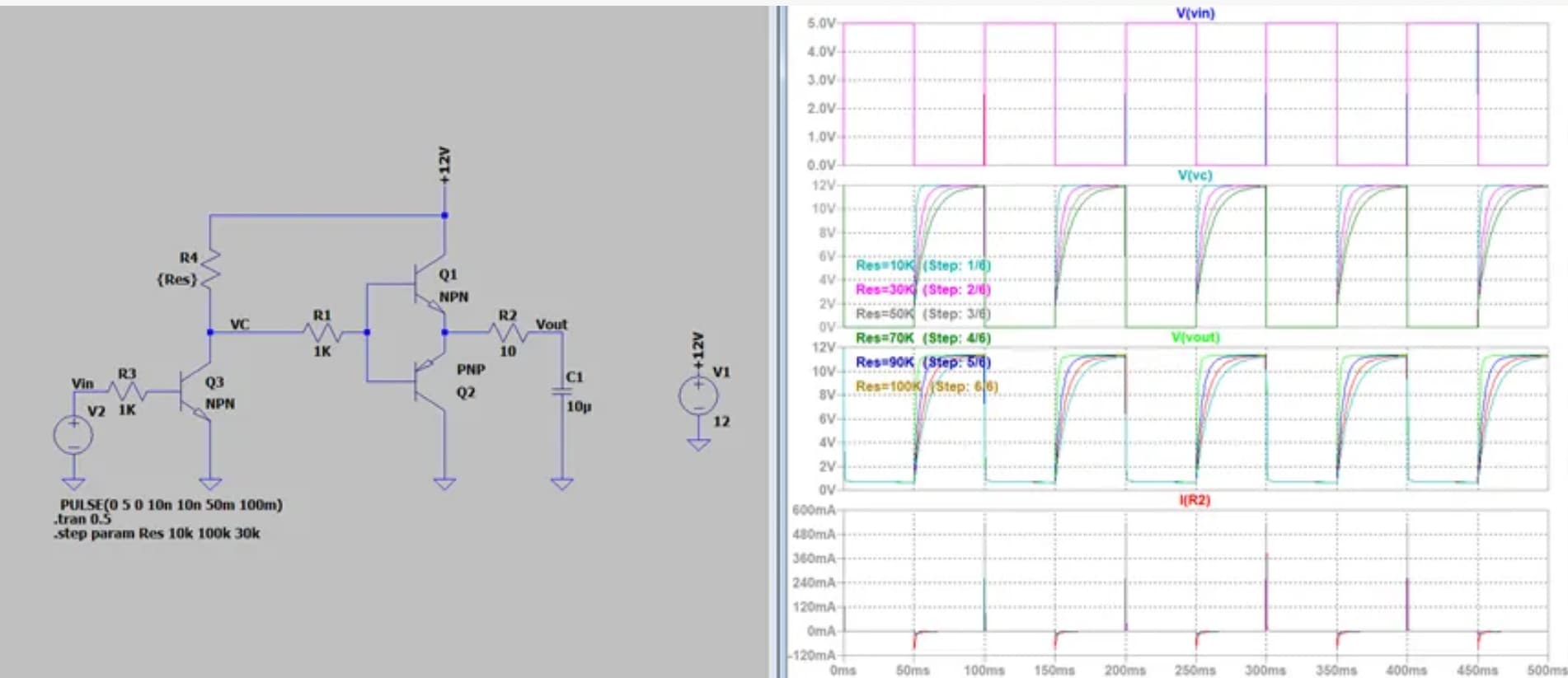 所以说,Q3的上拉电阻R3的取值不能太大,因为R3的大小直接关系到推挽输出上管Q1的基极电流Ib,(R1对上管和下管都有影响)。例如下图,对R3进行.step指令对其从10k到100k扫描,间隔30k,输出结果如下,可以看到,随着R3的增加,推挽输出波形上升的越缓慢,因为R3限制了上管Q1的输出能力: