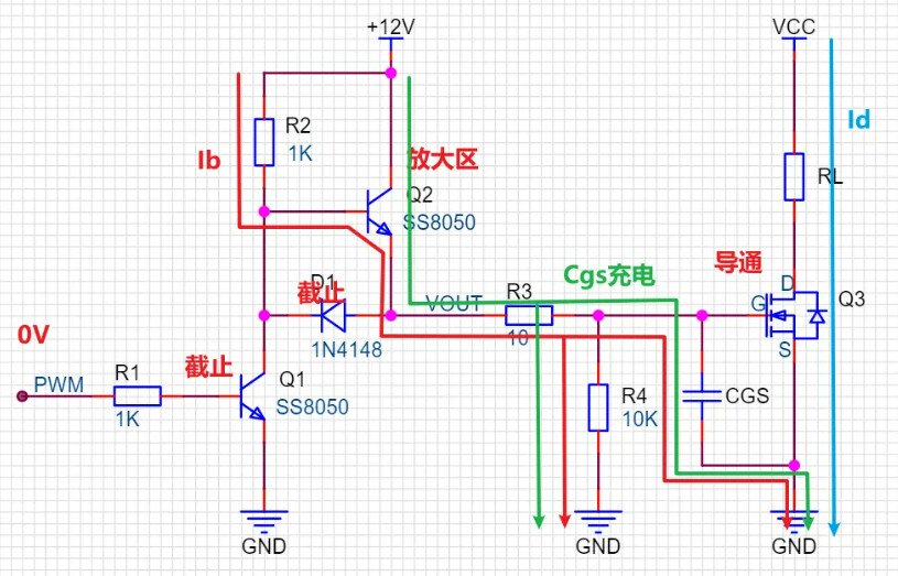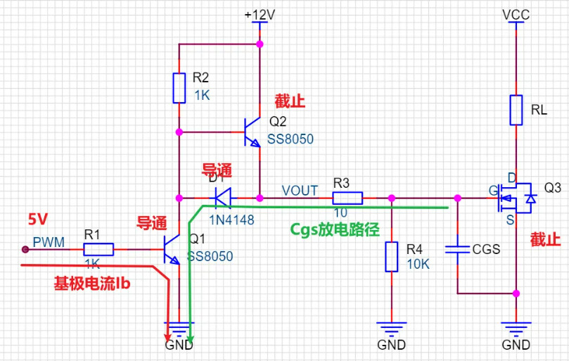 **当PWM为高电平时,三极管Q2截止,三极管Q1导通,MOS管Cgs电容通过二极管D1,以及三极管Q1快速放电。**由于三极管Q1的导通,VOUT的电压会很快降低为Vce+Vd,从而实现MOS管的Vgs电容快速放电。其中Vce为三极管的饱和压降,Vd为二极管D1的正向导通压降。电流路径为下图: