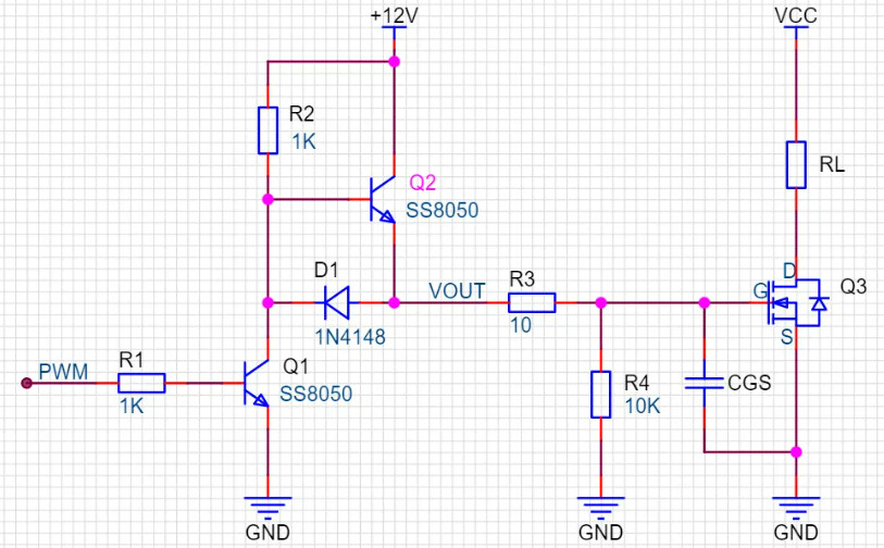本期的分享的是另一种形式的推挽电路。实现功能为,当PWM为高电平时,VOUT输出电平为低电平,关断MOS管Q3;当PWM为低电平时,VOUT输出高电平,打开MOS管Q3。电路图如下: