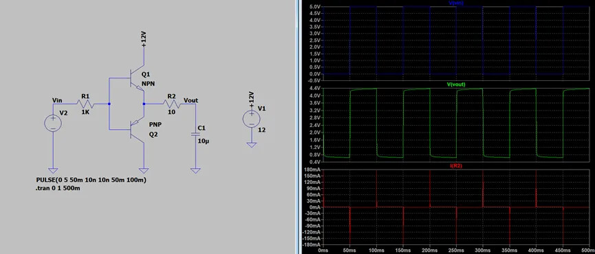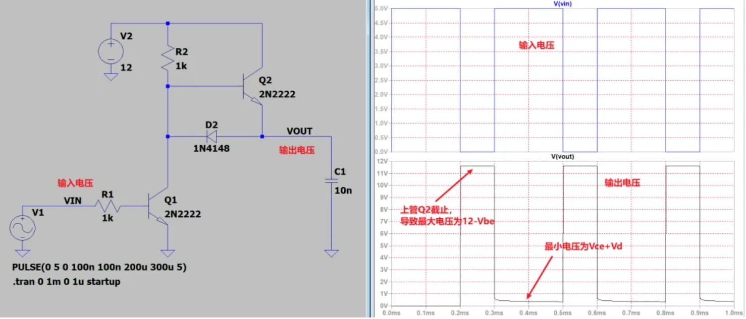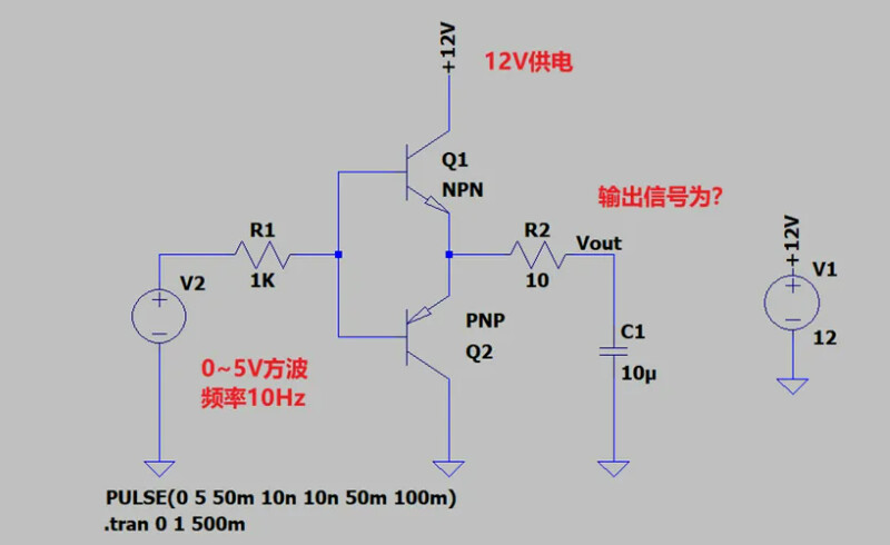那么这种电路的好处就是可以用低压(比如5V)去控制高电压(比如12V),而不像常规推挽输出,如果按照常规推挽输出,5V控制12V,那么输出结果会是0.7~4.3V的方波,例如下图:
