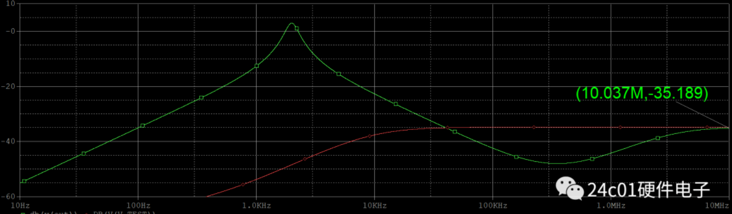 如下图参数&原理图所示,这是一个一阶的MFB型带通滤波器,在截止频率后,照理来说频率会以-20db/dec衰减,但是实际上发现,频率在到达300khz左右后便衰减不下去了,甚至幅频特性曲线在高频处发生了“上翘”;从而在高频处的滤波效果变差。那么究竟是怎么一回事呢?