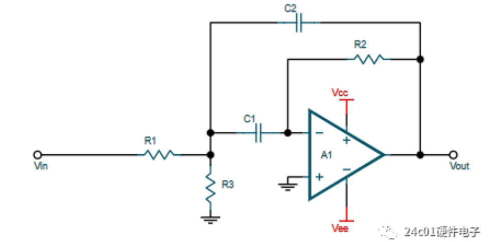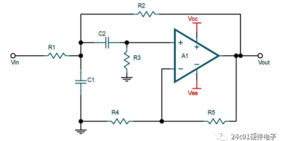 1.更换滤波器类型,例如本带通滤波器为MFB型带通滤波器,可更换为Sallen-key型滤波器,如下图所示,可以切断高频穿行路径(负反馈上的电容)。