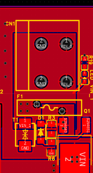 从接线端子到TVS再到保险丝最后再到MOS管,均采用大面积铺铜的连接方式。MOS的驱动电阻采用0805封装,MOS管的S和D引脚均打了过孔方便散热。最后, 三个MOS保护后的VIN电源网络采用大面积铺铜连接到MPM3519。