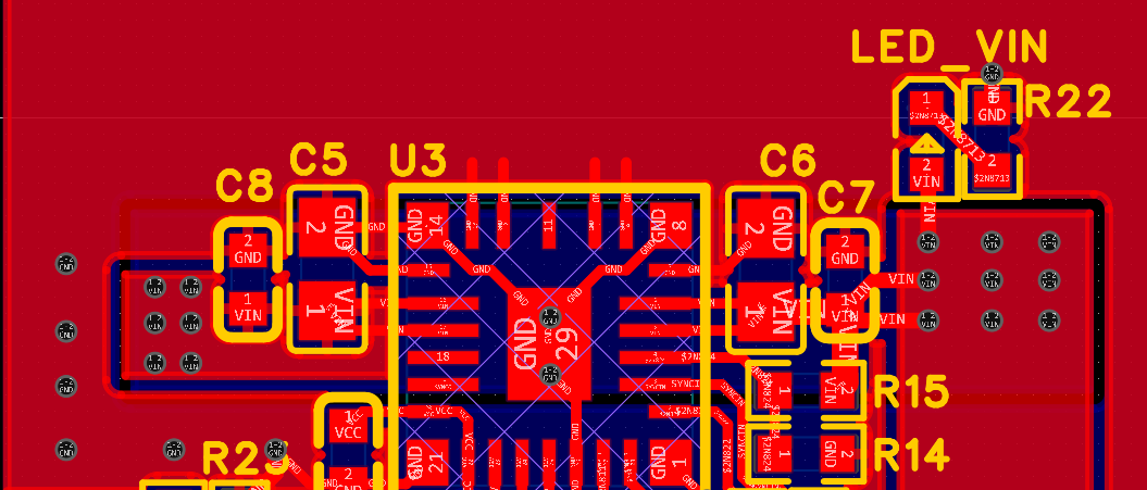 除开刚才提到的,bottom层方便电源输入引脚的VIN网络,其余的bottom是一个比较完整的GND平面,除开部分散热过孔的隔离。