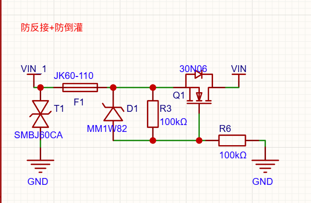 每路输入均采用以下设计,在TVS和自恢复保险丝的保护下,分别过滤超高电压和过流,二极管保护MOS管,R3和R6分压来驱动MOS管,防止VIN电流倒灌进VIN_1.