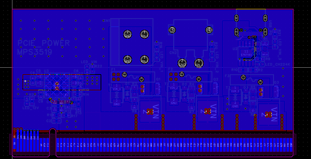 同时,为了方便使用,PCIE_POWER使用三路电源输入,输出一路12V。第一路是5.08mm间距接线端子的输入,第二路是XT30接口的输入,第三路是CH224K诱骗的PD输入。这三路尤其是PD,输入电压可能比较小,每路输入需要带放反接功能,以避免电源均连接时发生倒灌。