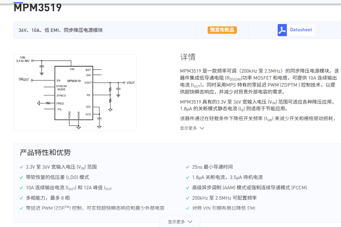 MPM3519 复用设计:沿用加速卡成熟的降压电路,输入侧并联 10uF+100nF 滤波电容,FB 引脚串联 390pF 电容,FREQ 脚接 34.8KΩ 电阻,输出端并联多颗电容强化大电流稳定性;