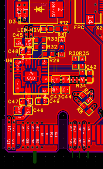 采用 4 层板结构,划分独立电源平面(12V)和地平面,3V3 电源平面与地平面紧密耦合,降低干扰;