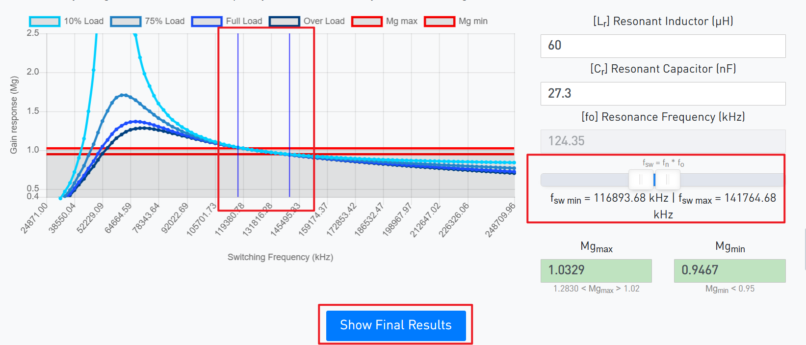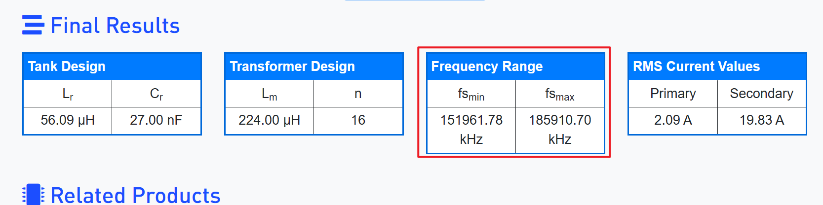 第二,关于开关频率范围:工具给出的频率上下限,并不是我们平常意义上“各工况的理论工作频率”,而是用户在增益曲线上手动划定的扫频窗口。也就是说,它展示的是“控制器允许扫的范围”,不是“实际会工作在哪”。如果把这两个概念混在一起,就会看起来像工具算错了,但实际上它只是一个界面呈现方式的问题。