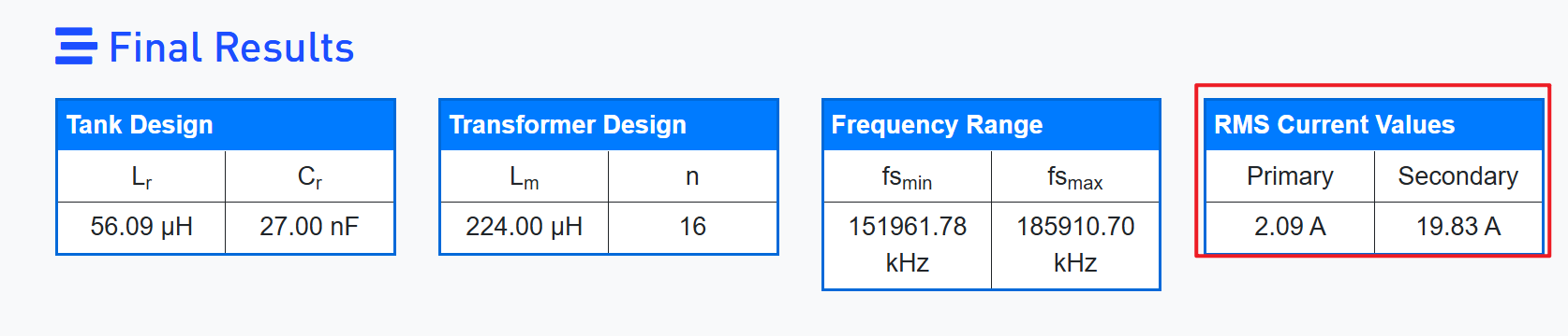 最后,关于原边/副边 RMS 电流的定义:计算本身没有问题,但工具界面上的文字描述确实不够清晰。它实际给的是谐振支路的原边 RMS 以及整流端的副边 RMS,但界面没有明确写出来,对初学者来说确实容易造成理解困难。