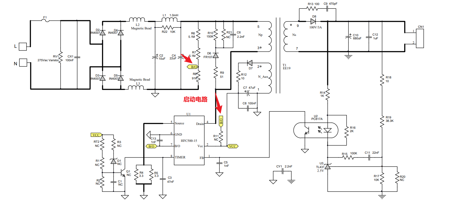 这个现象看着像是比较典型的电路进入打嗝保护状态, 感觉像是反馈回路出现了问题,导致芯片控制没办法稳定工作。输出电压在2.5V~4.5V跳变说明电源一直在在尝试启动,但每次输出电压刚要建立起来,就因为某种原因被强制关断,也就是芯片自保护了,然后再次尝试复位重启。 再结合你说的辅助绕组电压在6~13V跳变来分析,辅助绕组是给控制芯片供电。而反激芯片都有一个启动电压和一个欠压保护阈值。辅助绕组电压在6-13V跳变,说明芯片的VCC电压始终在欠压保护阈值上下徘徊,导致芯片反复地重启,我猜大概的逻辑是芯片启动 → 工作 → VCC下降 → 欠压保护关闭 → VCC通过启动电阻缓慢上升 → 再次启动。所以你重点查一下辅助绕组电路相关的元器件有没有焊反了,比如二极管,或者VCC引脚有没有跟其他的短路?电阻R5贴错了没?每个器件都核对一下