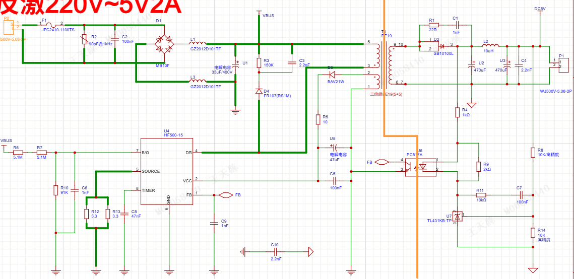 想请教您一个问题,我上次做了220V转5V的反激电源,但是在调试的时候遇到这样的问题:我的输出5V一直在2.5V~4.5V跳变,我的辅助绕组的电压在6~13V左右跳变,这可能是什么原因呢?是因为我的变压器问题导致辅助绕组的电压一直跳变,还是我的反馈电路?(我反馈电路是按照芯片规格书设计的)