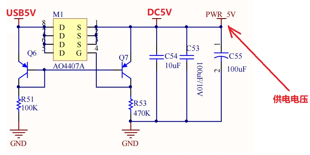 在使用USB5V单独供电时,上电瞬间Q6的基极及Q7三极管的基极是低电平,此时三极管Q6导通,导通后Q7基极为高电平,三极管Q7截止,Q7的集电极保持低电平,M1的栅极G保持低电平,进而M1导通,此时系统由PWR_5V近似为USB5V端口的电压。