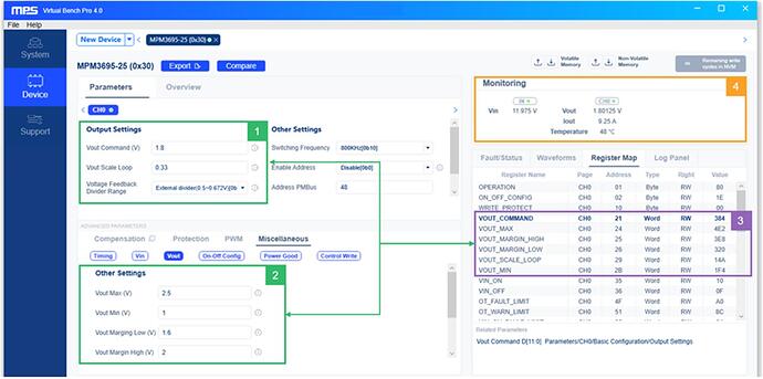 “Parameters”(参数)标签页分为两个区域:上方为基本参数,下方为高级配置。图 7 中的 Box 1 显示了 VOUT_COMMAND(21h)、VOUT_SCALE_LOOP(29h)和 MFR_CTRL_VOUT(D1h)的配置;Box 2 显示了以下 VOUT 命令:VOUT_MAX(24h)、VOUT_MIN(2Bh)、VOUT_MARGIN_LOW(26h)和 VOUT_MARGIN_HIGH(25h)。每个寄存器的配置值(十六进制格式)可在 Box 3 的 “Register Map” 标签页中查看(见图 7)。