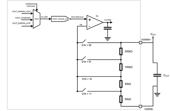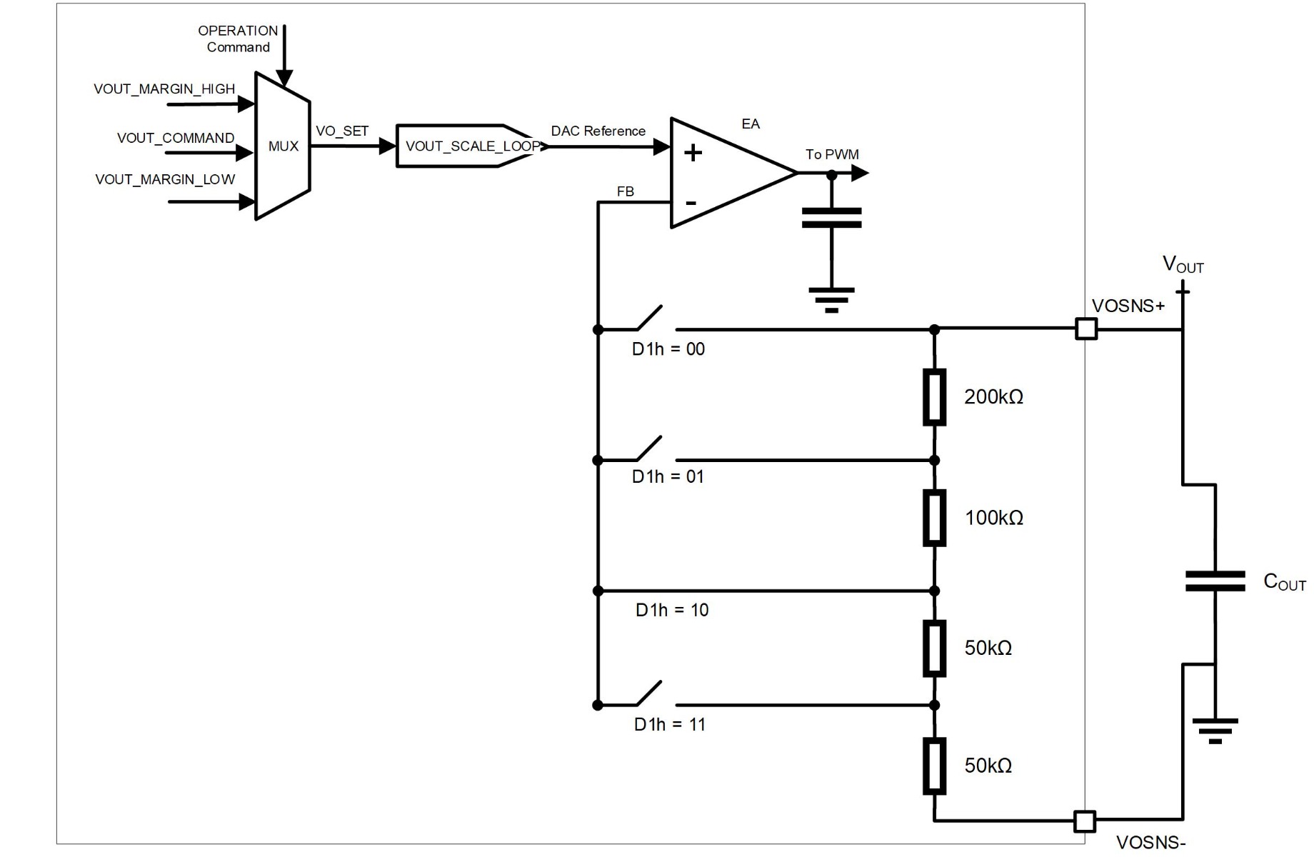 一旦确定了所选电压值,它会与 VOUT_MAX 和 VOUT_MIN 命令设定的 VOUT 上下限进行比较,从而保证 VOUT 保持在安全范围内。最后,应用一个缩放系数来匹配参考电压。