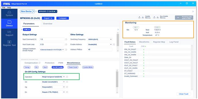 MPM3695 系列电源模块还支持遥测命令,例如 READ_VIN(88h)、READ_VOUT(8Bh)、READ_IOUT(8Ch)和 READ_TEMPERATURE(8Dh)。这些命令分别用于实时监测输入电压 (VIN)、VOUT、负载电流以及温度。在图 7 的 Box 4 “Monitoring” 区域中可以看到这些监测值。