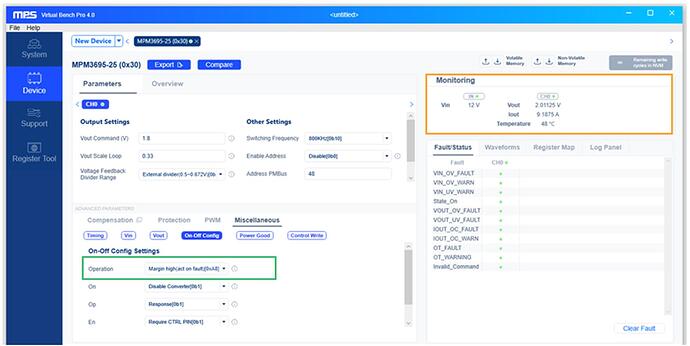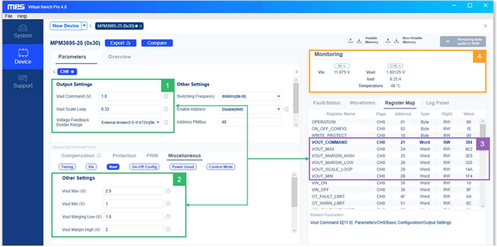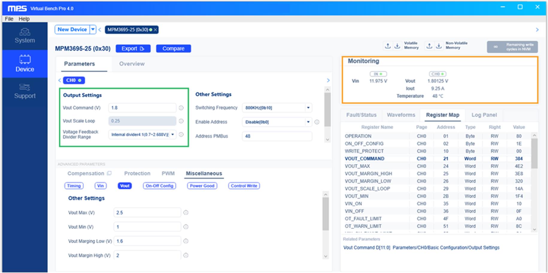 通过MPS 的 Virtual Bench Pro 4.0 GUI图形用户界面(GUI)可以对 MPM3695 系列进行配置。图 7 展示了本例中使用的主要 PMBus VOUT 命令。